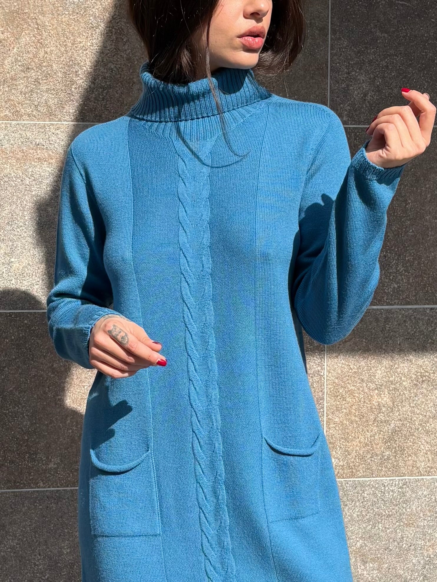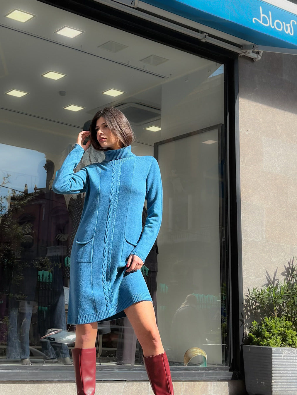 Avvolgente e sofisticato, questo abito in maglia è il capo perfetto per affrontare la stagione fredda con stile. Realizzato in filato morbido e caldo, presenta un elegante motivo a treccia sul davanti che aggiunge un tocco di texture e femminilità. Il collo dolcevita dona un’allure raffinata e protegge dal freddo, mentre la linea leggermente svasata valorizza la silhouette mantenendo il massimo comfort.