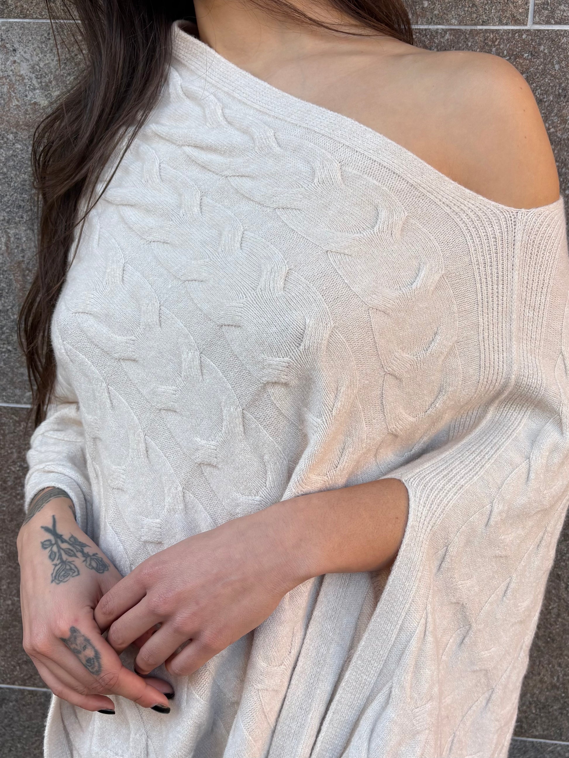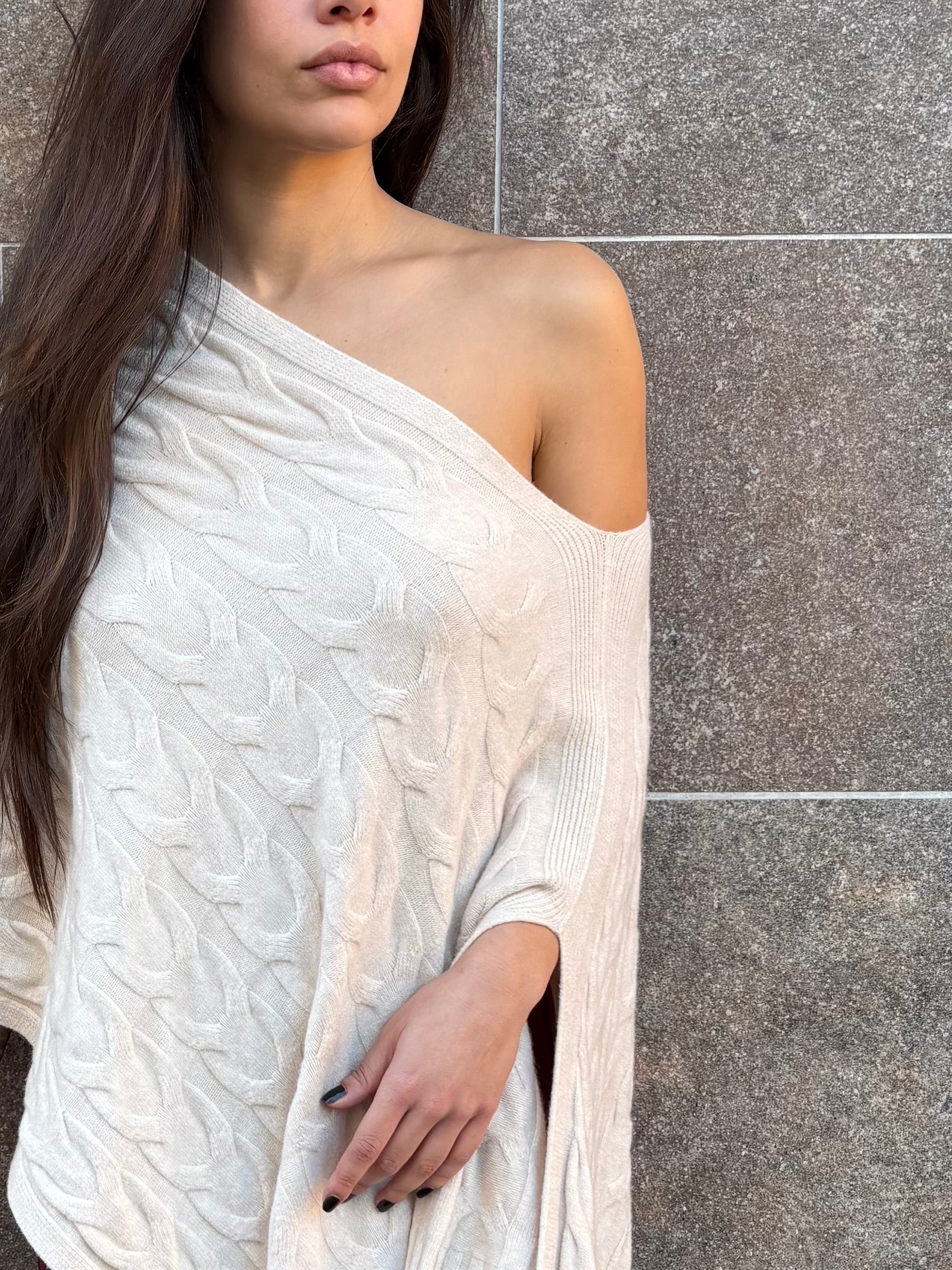 Avvolgiti in un abbraccio di calore e stile con la mantella a trecce, il capo perfetto per la stagione fredda. Realizzata con un filato morbido e avvolgente, presenta una raffinata lavorazione a trecce che aggiunge un tocco di artigianalità e classe al tuo look.