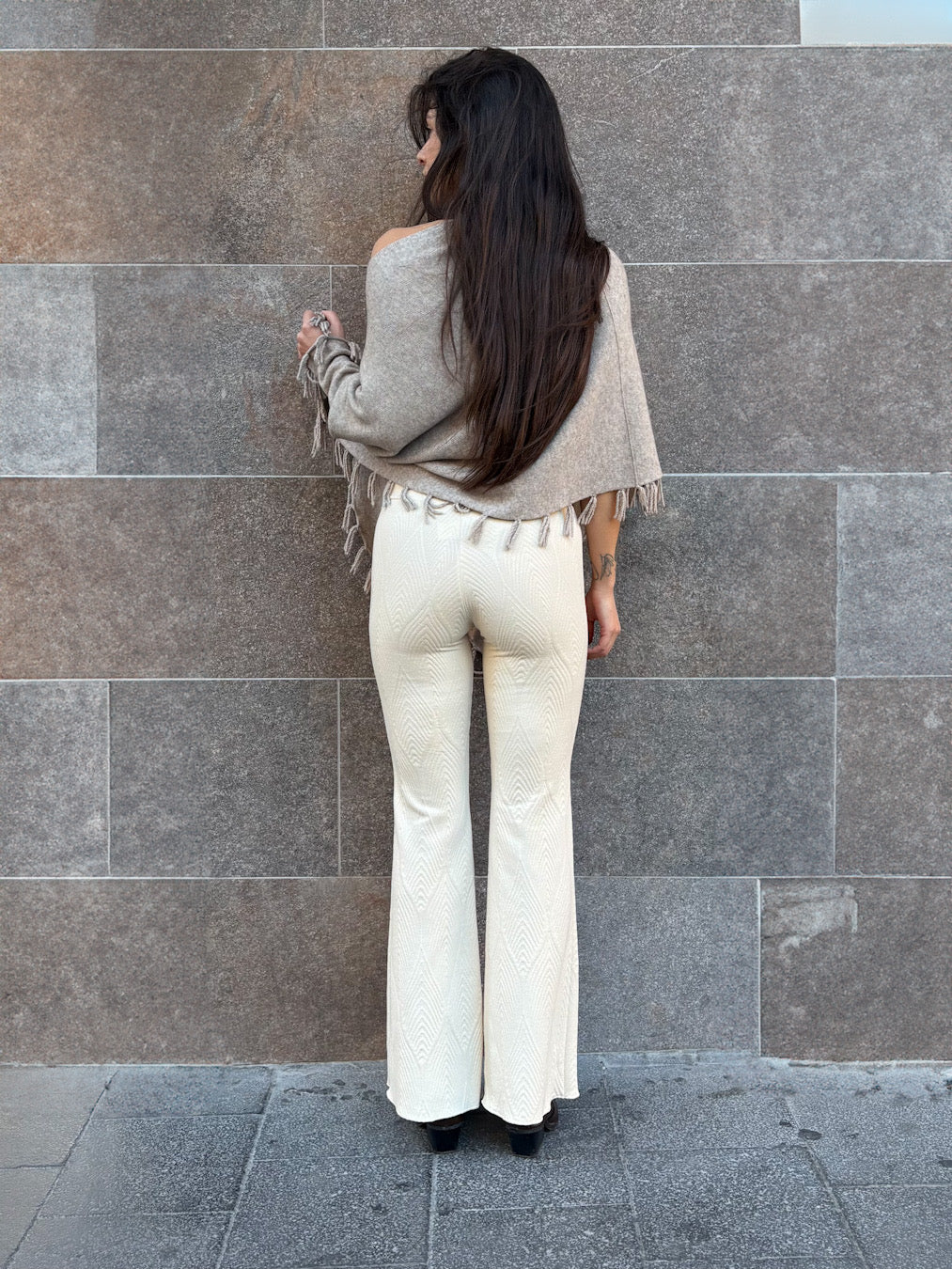 Scopri il comfort e lo stile dei nostri Pantajazz in tessuto a rilievo. Realizzati con un tessuto morbido ed elasticizzato, questi pantaloni valorizzano la silhouette senza rinunciare alla comodità. Il design a gamba svasata dona un tocco di eleganza retrò, ideale sia per outfit quotidiani sia per serate speciali.