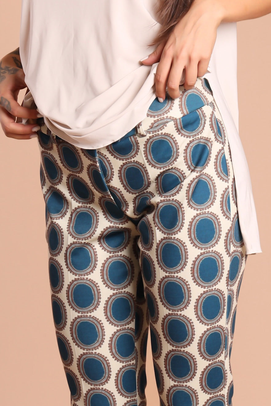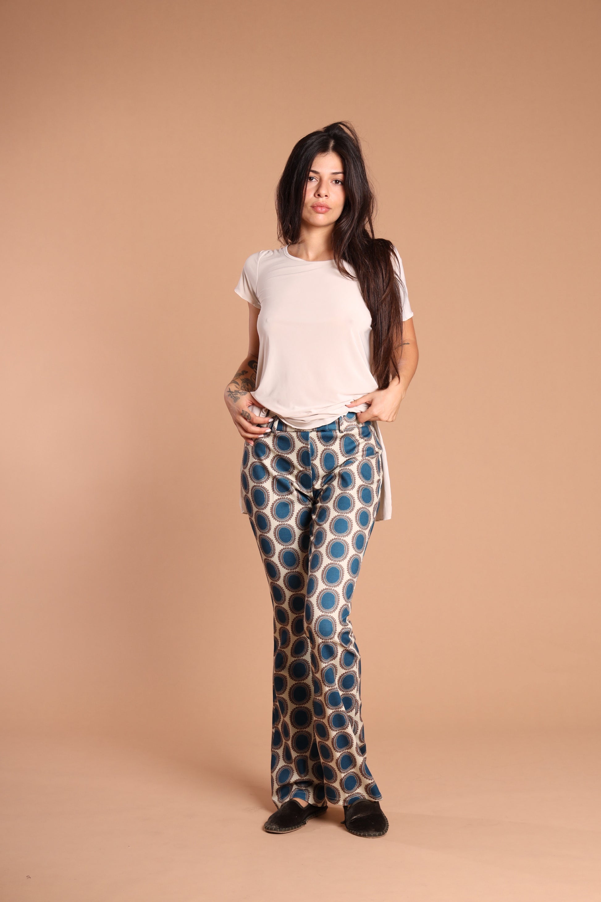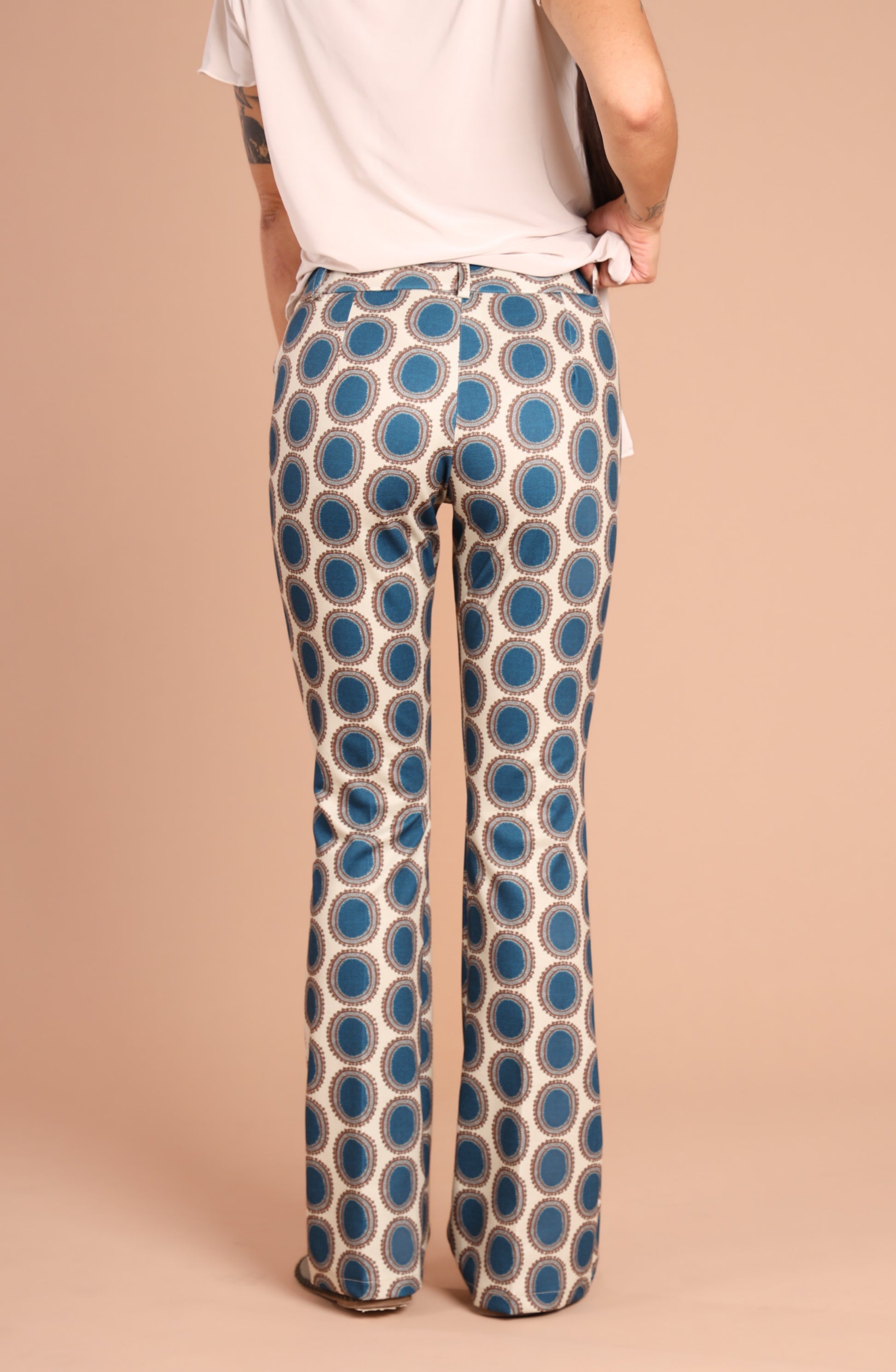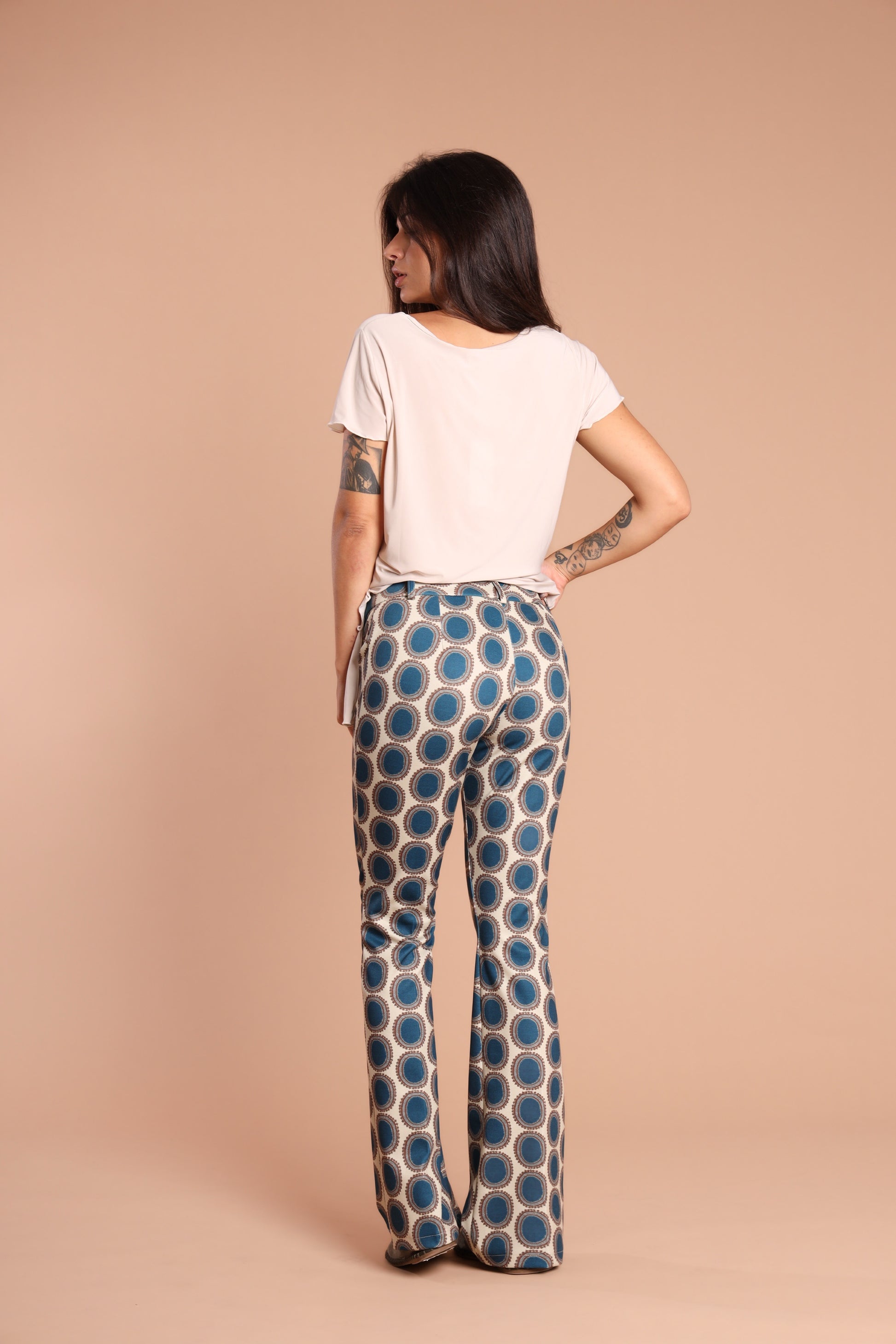 Un classico anni ’70, rivisitato con carattere. Questo pantazampa a fantasia optical è pensato per donne che vogliono distinguersi con eleganza, senza rinunciare al comfort. Il taglio svasato slancia la figura, la fantasia grafica cattura lo sguardo.