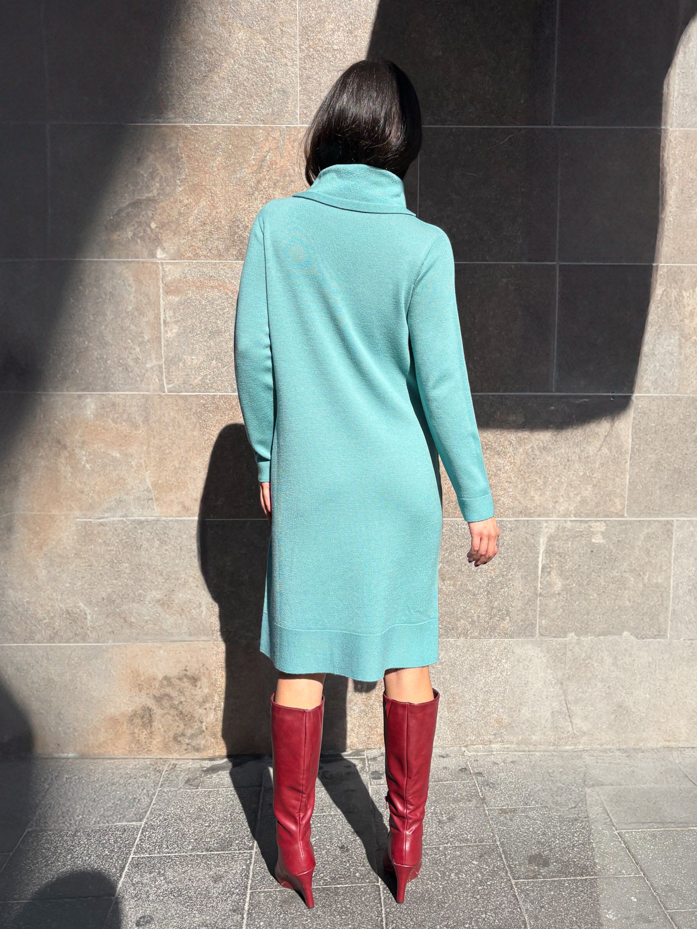 Raffinato ed essenziale, questo abito in maglia è la scelta perfetta per chi cerca eleganza e comfort in un unico capo. Realizzato in 100% lana vergine, offre una sensazione di calore naturale e una vestibilità morbida, ideale per la stagione fredda. Il design è impreziosito da un collo a ciambella, che avvolge delicatamente il collo aggiungendo un tocco sofisticato. La lunghezza midi, che scende sotto al ginocchio. Completano il look le taschine frontali con bottoni decorativi, dettagli che uniscono praticità e stile. Il tutto nella delicata e luminosa tonalità tiffany, perfetta per distinguersi con classe.